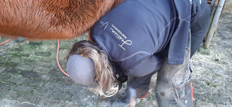 Het is november 2020, ik kwam voor het eerst voor hen en ze stonden al klaar, Anniek en haar grote bruine merrie Faleida, die me met haar grote bruine ogen, schichtig aankeek. Anniek had Faleida nog niet zo lang en dit was de eerste keer dat ze bekapt zou worden. We wisten toen nog niet hoe ze dat zou vinden, maar daar kwamen we snel achter. Alles behalve tof en omdat te laten merken was ze niet bang om haar tanden te gebruiken of een been terloops eens mijn kant op te laten gaan. Haar hoeven waren plat, gespleten, ze had rotstraal en behoorlijk wat kneuzingen. Werk aan de winkel dus, zowel voor Anniek als voor mij!